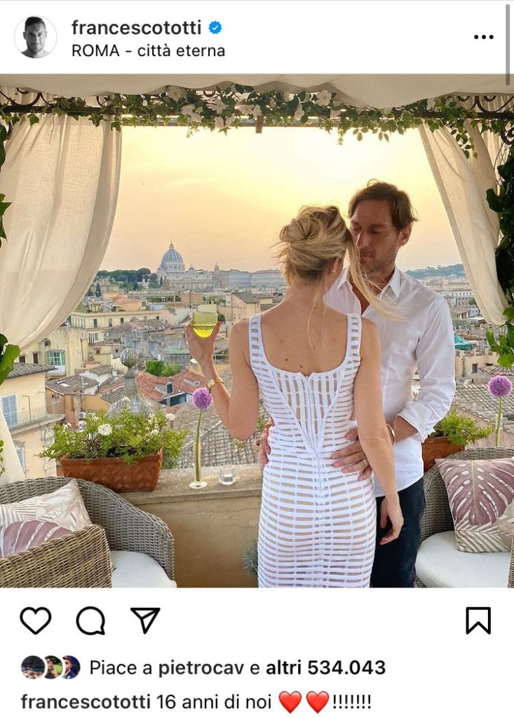 Lo scatto li ritrae su una terrazza della loro amata città, Roma. Entrambi vestiti di bianco, i due si guardano teneramente negli occhi. Ilary commenta la foto riportando la data del loro matrimonio: 19.06.2005. Francesco Totti, inguaribile romantico, scrive:”16 anni di noi” con tanto di cuoricino finale.
